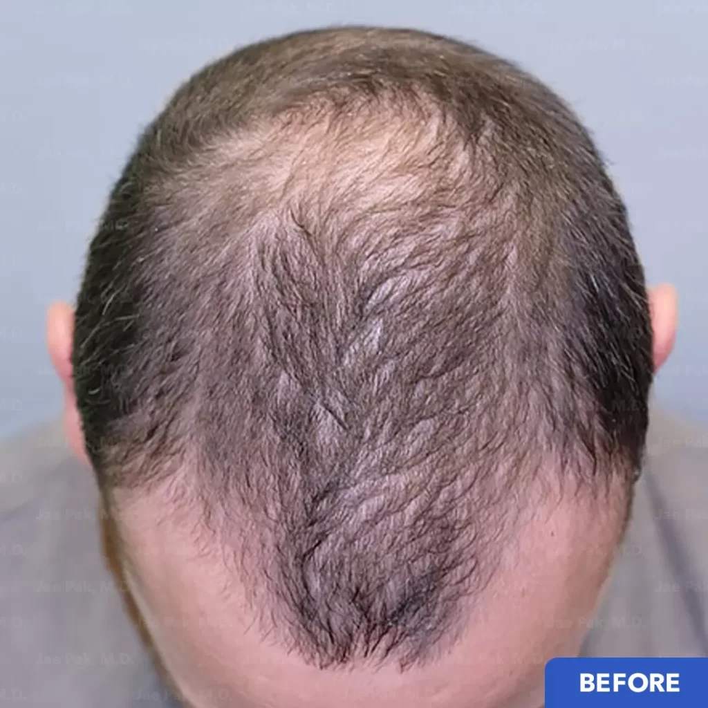 Because the hairs are removed individually, an FUE hair transplant procedure will not leave a linear scar on the back of the scalp as with FUT surgery. Instead the scars are individual scars the size of a pin prick scattered throughout the back of the scalp, that are difficult to detect, even when looking from a close distance.
